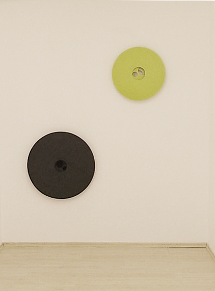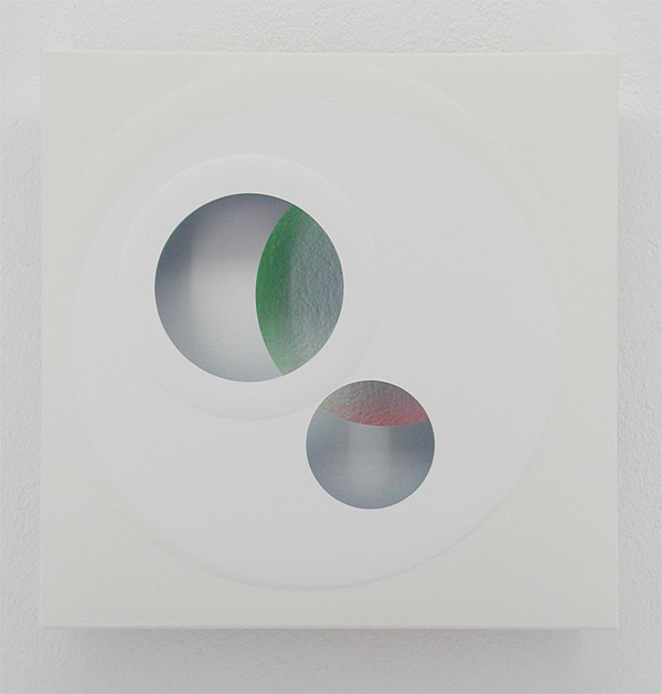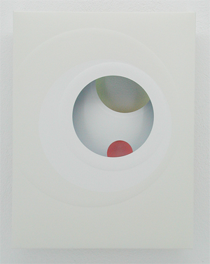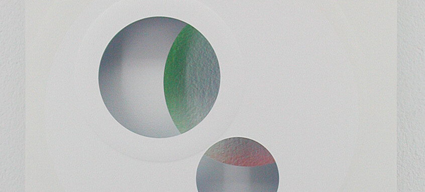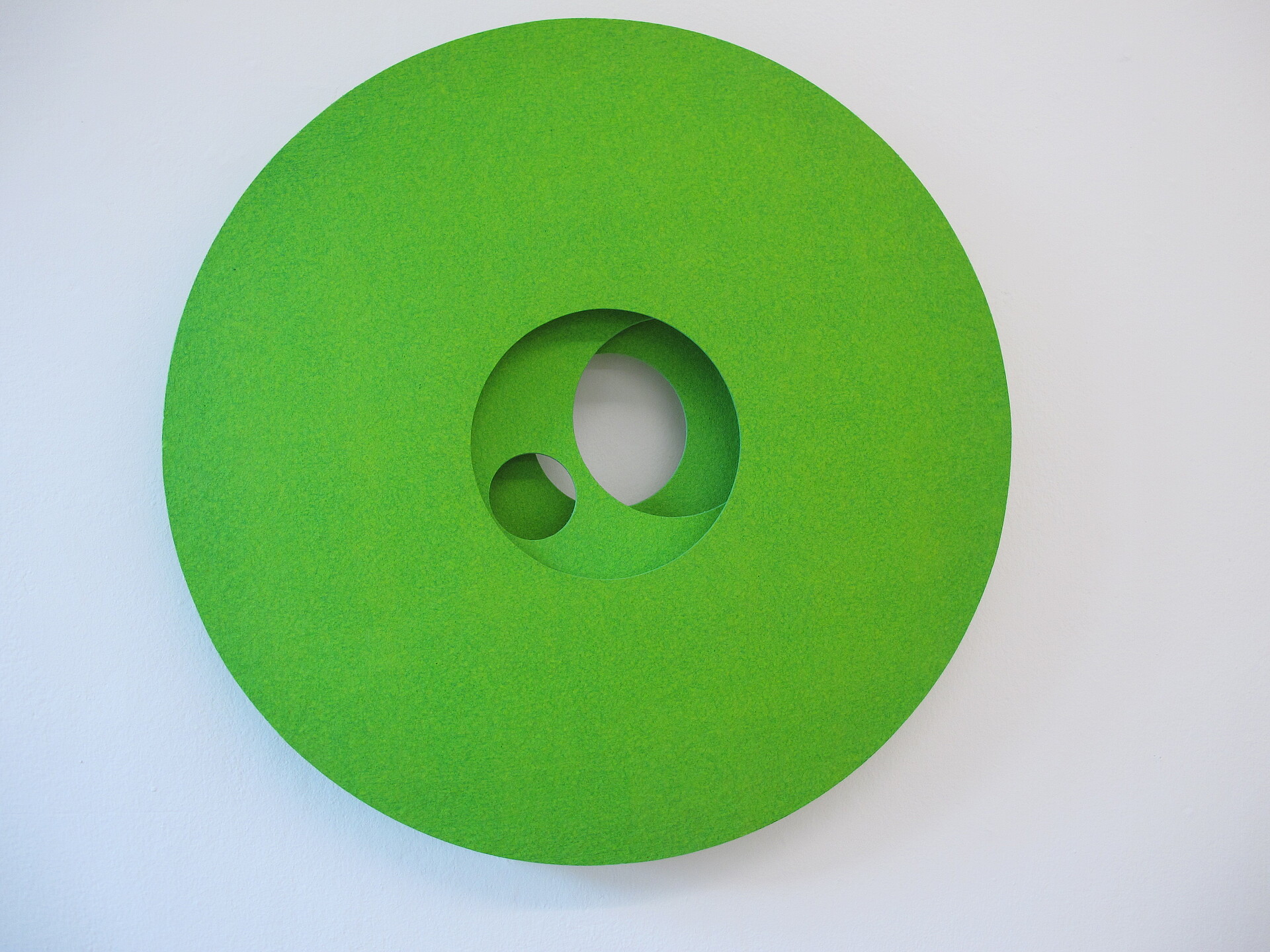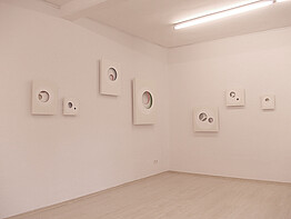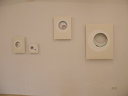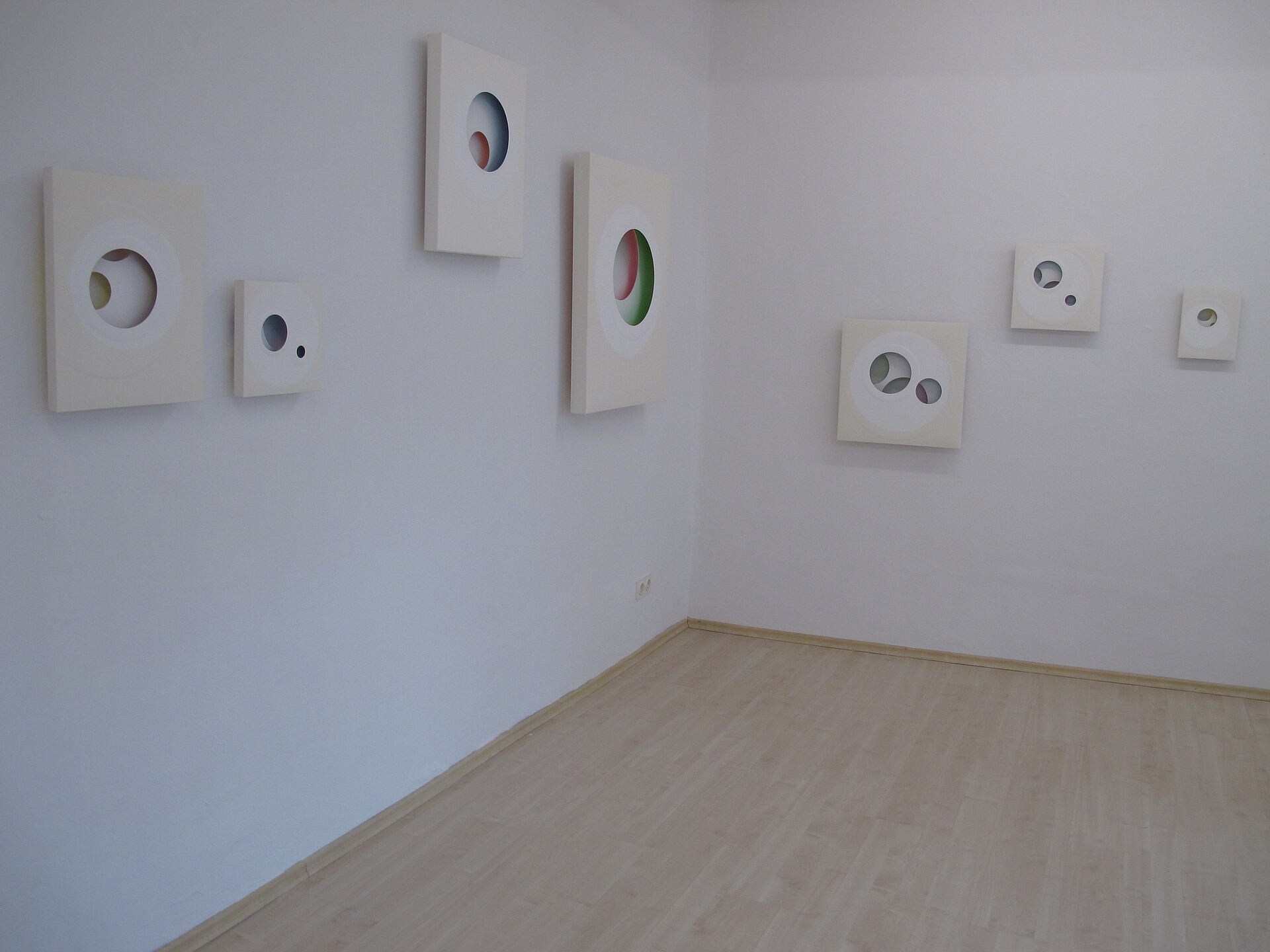 Die Papier-Objekte entstehen aus eingefärbtem Papiermaché, welches bildhauerisch bearbeitet wird. Der zu Scheiben gewalzte Karton wird mit dem Hammer zu konvex-konkaven Formen getrieben. Durch eine kreisrunde Öffnung der Hohlkörper wird Raum sichtbar und ihr Inneres dem Betrachter preisgegeben. Wird zudem der Objektrücken geöffnet, integriert sich die Wand als Bildbestandteil und fügt dem Bildraum eine zusätzliche Dimension hinzu. Je nach Position des Betrachters, Richtung und Menge des Lichteinfalls ergeben sich vielfältige formmodulierende Varianten und farbräumliche Stimmungen. Konstruktivistisch räumliche Objekte entstehen, welche den Schattenwurf malerisch und subtil nutzen. Sie ermöglichen dem Betrachter, intuitiv die Definition von Farbe, Form und Raum auf das Engste miteinander zu verbinden.